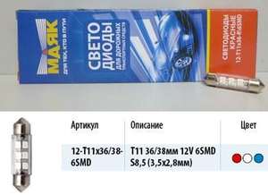 Лампа светодиодная 24V T11 салон. 36/38мм 6 диодов SMD белая (SV8.5) Упаковка 10шт (МАЯК) (500) 3528